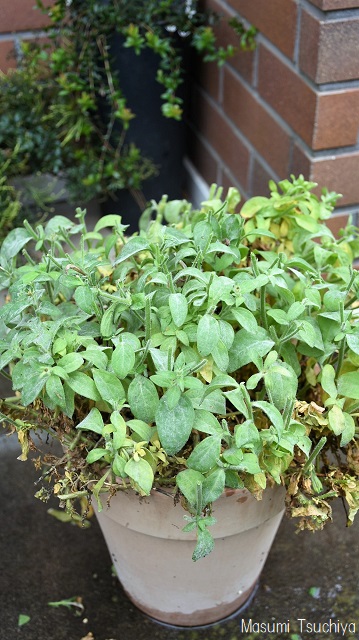 玄関前のペチュニア・ ウドンコ病が凄い 5/16/2023 5月初め、ご機嫌に大きくなっていた2年目のペチュニア ジュノー(1株)です。高さのある鉢の中に鉢ごと入れています。ところが、このところの雨でウドンコ病になってしまいました。シルバーリーフみたいです。バッサリ切って、このあと丁寧に枯れ葉を取りました。代わりに玄関前には、これまた2年目のサフィニア(1株)。こちらはまだ?ウドンコ病になっていませんが、反省して薬剤を散布しました。枯れた下葉も取りました。八王子地方、今日やっと晴れです。人気ブログランキングへ ←押してみる? 共有 リンクを取得 Facebook × Pinterest メール 他のアプリ 共有 リンクを取得 Facebook × Pinterest メール 他のアプリ コメント